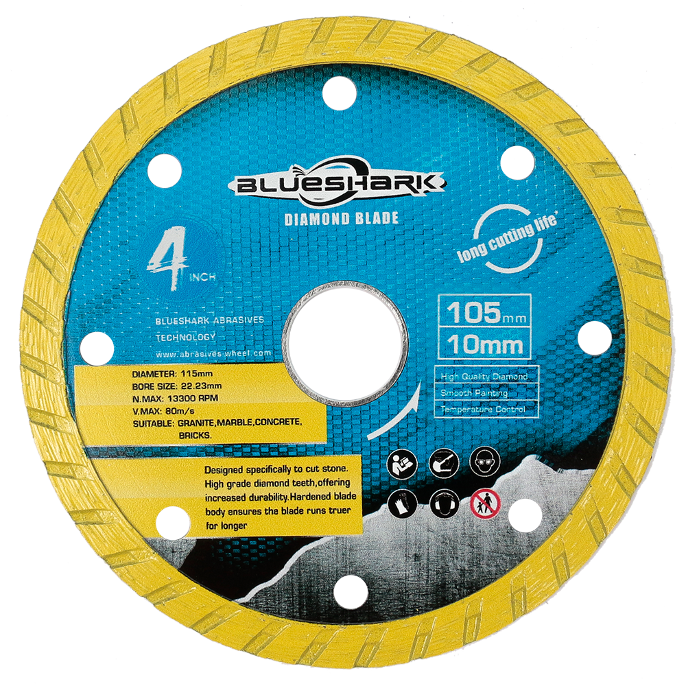 Offering a comprehensive range of quality Diamond blades for all industrial applications has established Blueshark as a global leader in this field. Blueshark diamond wheel designed for stone, concrete and brick applications. Turbo rim blades deliver up to 5x longer life and smooth cutting performance in hard materials versus standard blades. For use in high-speed saw.
